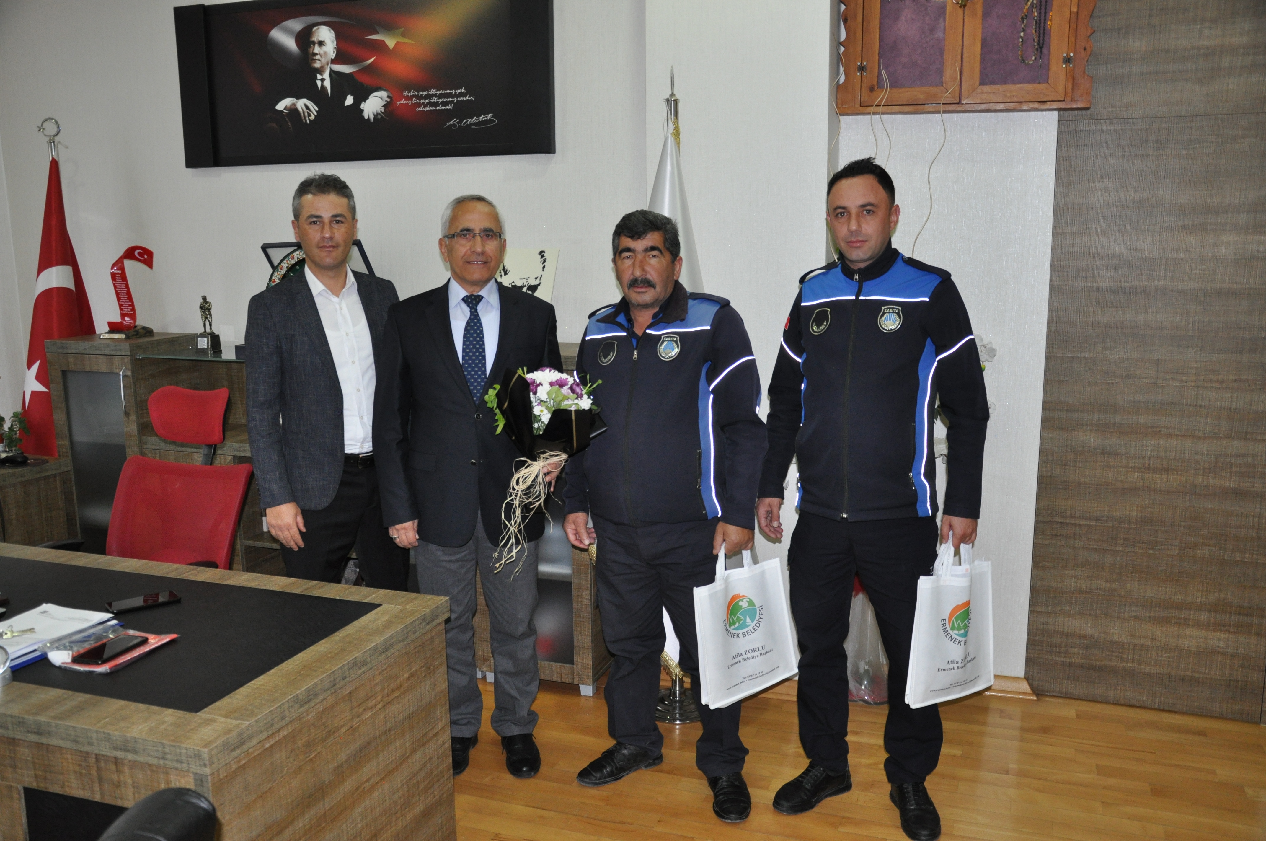 Ermenek Belediyesi Zabıta ekipleri geçtiğimiz günlerde İlçemiz okullar bölgesinde denetimden dönerken tesadüfen gördükleri plastik bidona kafası sıkışan köpeği kurtararak tekrar yaşam alanına bırakmışlardı. Bugün ise Zabıta Personelleri makamında ağırlayarak bir süre sohbet edip, kendilerine teşekkür eden Belediye Başkan V. Nihat Azdural, ‘’bu davranış Ermenek insanının hayvanlara bakış açısını ortaya koyan bir davranıştır. Bu davranışlarından dolayı arkadaşlarımıza tekrar teşekkür ediyorum. Bütün insanlığa ve çalışanlarımıza örnek olmasını diliyorum’’ dedi.
